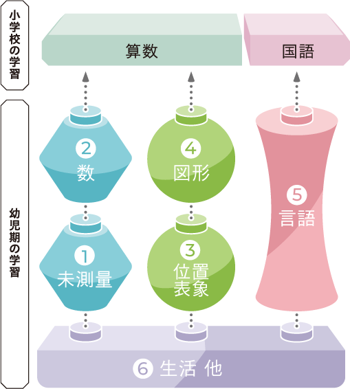 算数や国語など教科学習の土台として、6つの領域を定めています。学びのベースに「生活」があり、「数」の前提に「比べる・測る」が、「図形」の基礎に「位置と空間」があり、これらが算数につながります。「言語」では聞く・話すを基本に国語の基礎を身につけます。